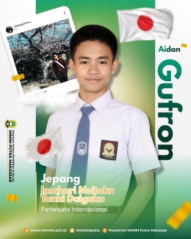 Sementara itu, santri kedua, Aidan, berhasil meraih kesempatan studi di Imabari Meitoku Tanki Daigaku, Jepang, pada program Pariwisata Internasional. Jepang sebagai salah satu destinasi wisata dunia memberikan peluang besar bagi Aidan untuk mengembangkan wawasan global, khususnya dalam industri pariwisata yang terus berkembang pesat.